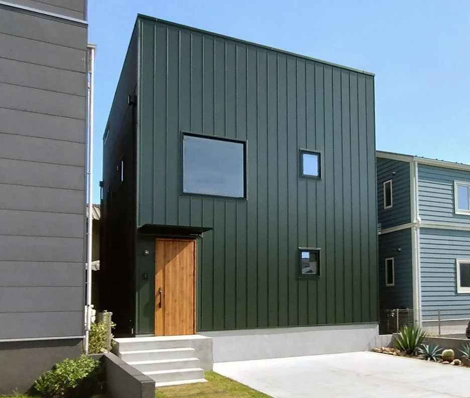 外観は、深いディープグリーンのガルバリウム外壁が印象的なキューブ型のフォルムです。シンプルなデザインながらも、湘南エリアの自然と調和した独自の魅力を持っています。室内に足を踏み入れると、木材を多用した温かみのある空間が広がり、居心地の良さが感じられます。特に玄関ホールからリビングダイニングキッチン(LDK)にかけての一貫したデザインは、来客を迎える際にも温かみを与えます。