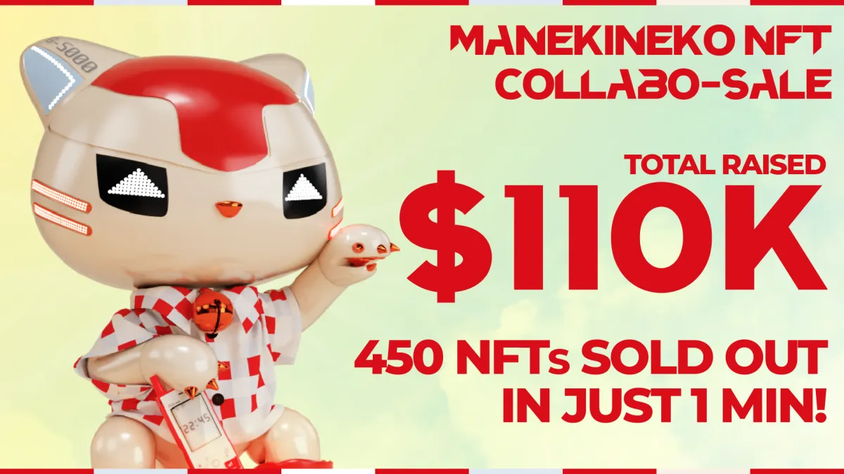 2025年5月13日、Web3ライフスタイルアプリ「SyFu」を運営する株式会社GINKANの子会社Unlock Lab Ltdグループが、KDDIとの連携で発行したコラボNFT「MANEKINEKO」のセールを開始しました。その結果、なんと販売開始からわずか1分で全450個が完売し、最終的な申込総額が1,600万円(約110,000 USD)を超えるという驚異的な数字を記録しました。