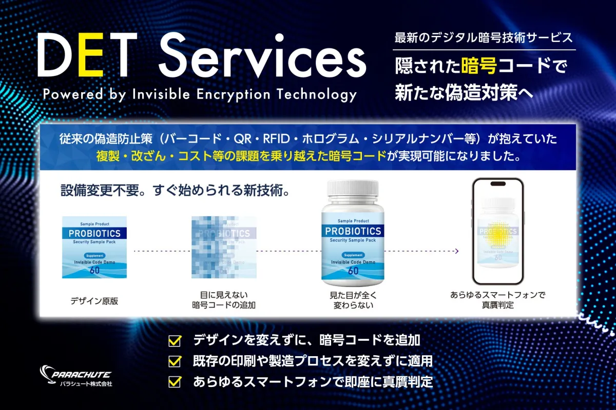 東京都世田谷区に本社を置くパラシュート株式会社が、2025年7月1日から「デジタル暗号化技術サービス」(DET Service)の提供を開始します。このサービスは、印刷物に目に見えない暗号コードを追加することで、製品の偽造を防ぐだけでなく、流通過程での不正を防止し、さらには市場の製品動向データの活用を可能にします。