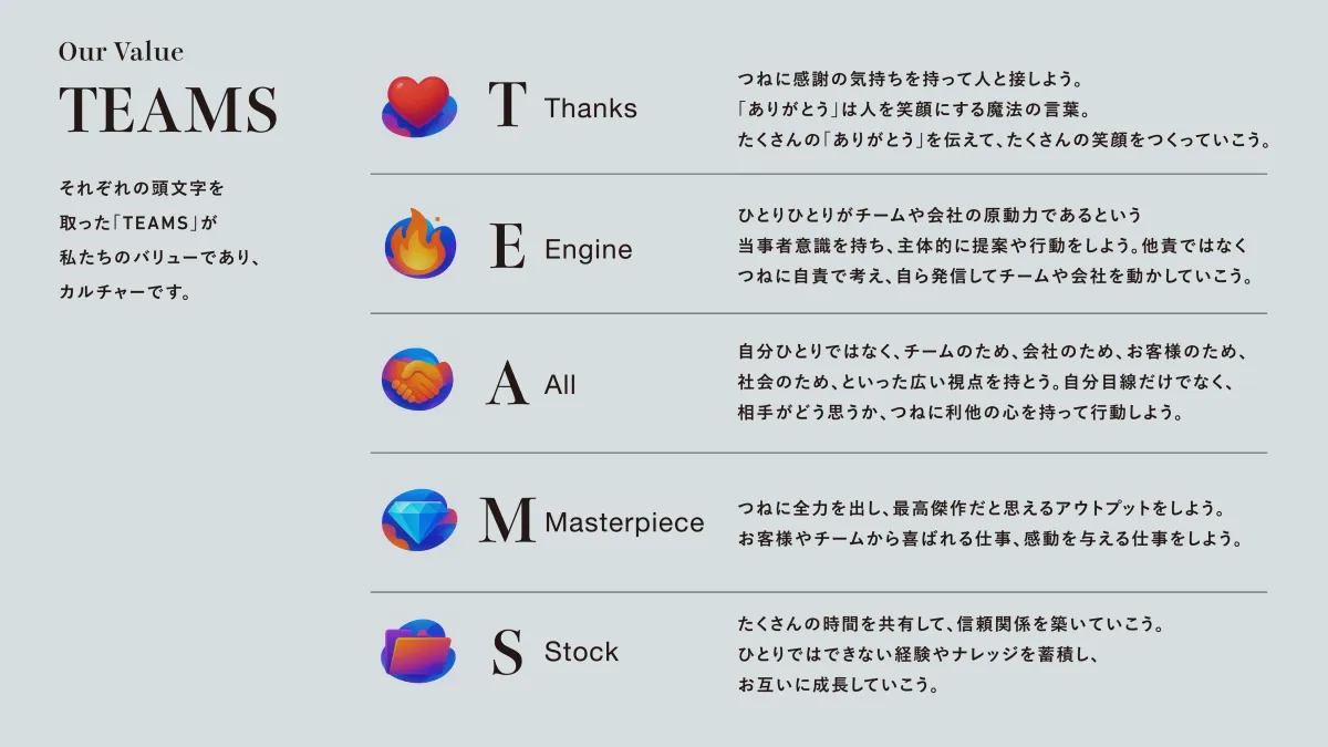 METATEAMの特徴は、年次や役職に縛られないフラットな組織文化にある。全社員が一丸となり、自由に意見を交換し、互いに尊重し合いながら活動する姿勢が求められる。このような環境では、誰もが気軽に提案を行い、問題解決に向けたアイデアを出し合うことができる。この「チームワーク重視」の文化が、社員一人ひとりの成長を促し、組織全体のパフォーマンス向上にもつながっている。