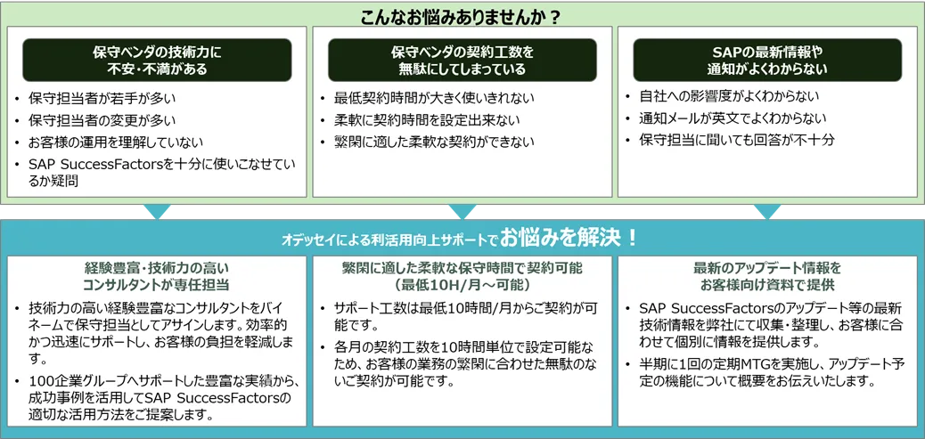 オデッセイは、27年以上にわたってSAP人事ソリューションの導入と保守を行ってきた実績を持ち、多くのユーザーからのニーズに応える形でこのサービスを展開します。導入後に運用保守のサポートが不十分と感じる企業に対し、他のベンダーが導入したシステムでも対応可能な点が特長です。これにより、全ユーザーが自社の状況に応じた的確なサポートを受けられる体制が整えられることになります。
