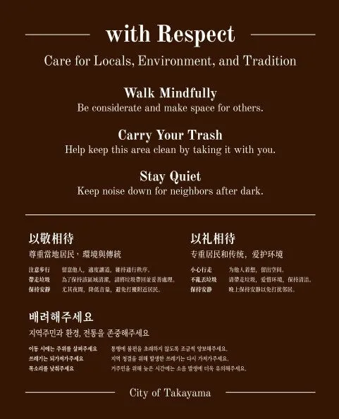この「with Respect」のメッセージは、観光施設の看板やバスの車内でも今後引き続き発信される予定です。高山市は、住民と観光客が共に気持ちよく過ごせるまちづくりを推進し、地域の文化を尊重する取り組みを強化していく考えです。より多くの観光客に地元の魅力を理解してもらい、地域との良好な関係を築くことが期待されています。