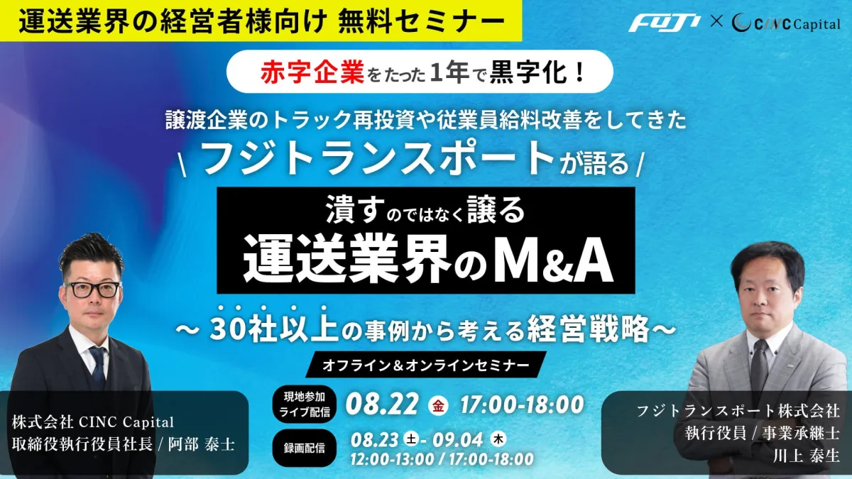 株式会社CINC Capital(以下CINC Capital)が主催する特別ウェビナー『赤字企業をたった1年で黒字化!フジトランスポートが語る「潰すのではなく譲る運送業界のM&A」』が、運送業界における経営者のために開催されます。