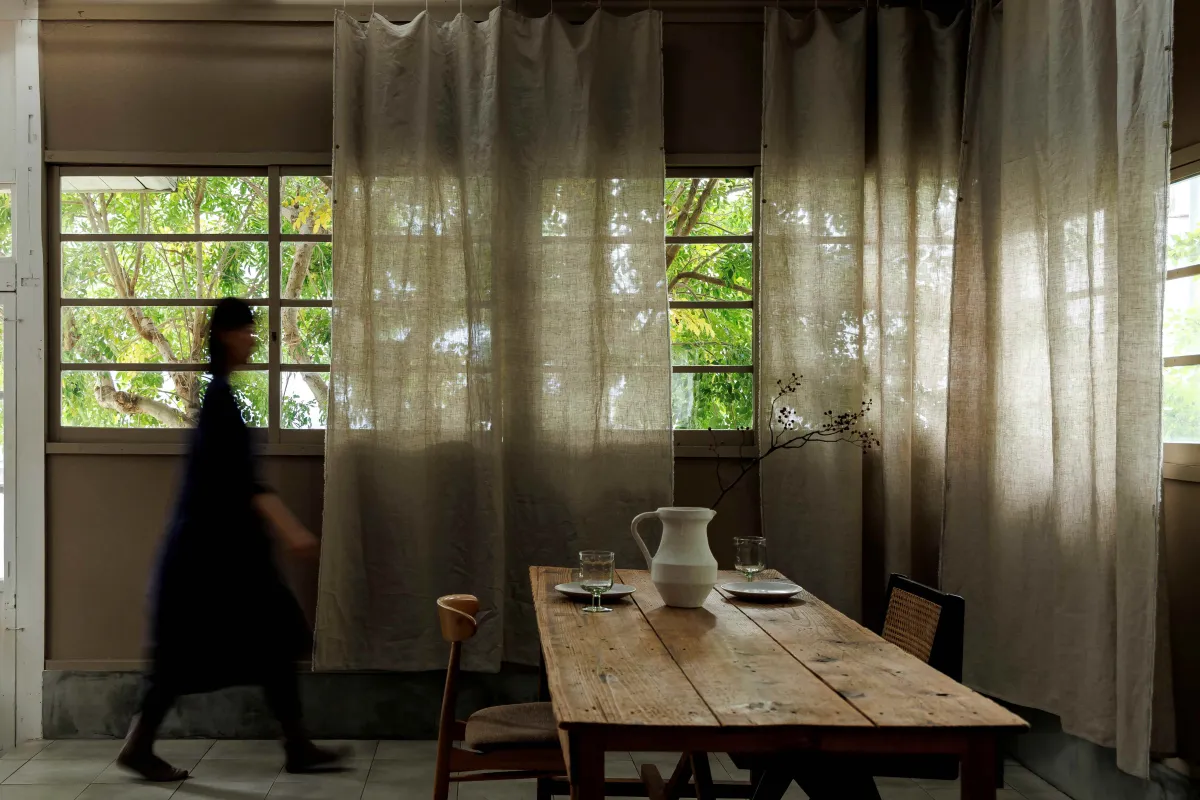 『ブラックソイルヘンプ』を手がけるのは、滋賀県で培われた麻織物の技術を受け継ぐ藤居織物さんたちです。彼らが生産するこのカーテンは、一日で織れる量が非常に限られており、そのため熟練した職人の技と意志が込められています。職人の手によって生まれる布は、ただのインテリアではなく、文化と歴史の一部となるのです。