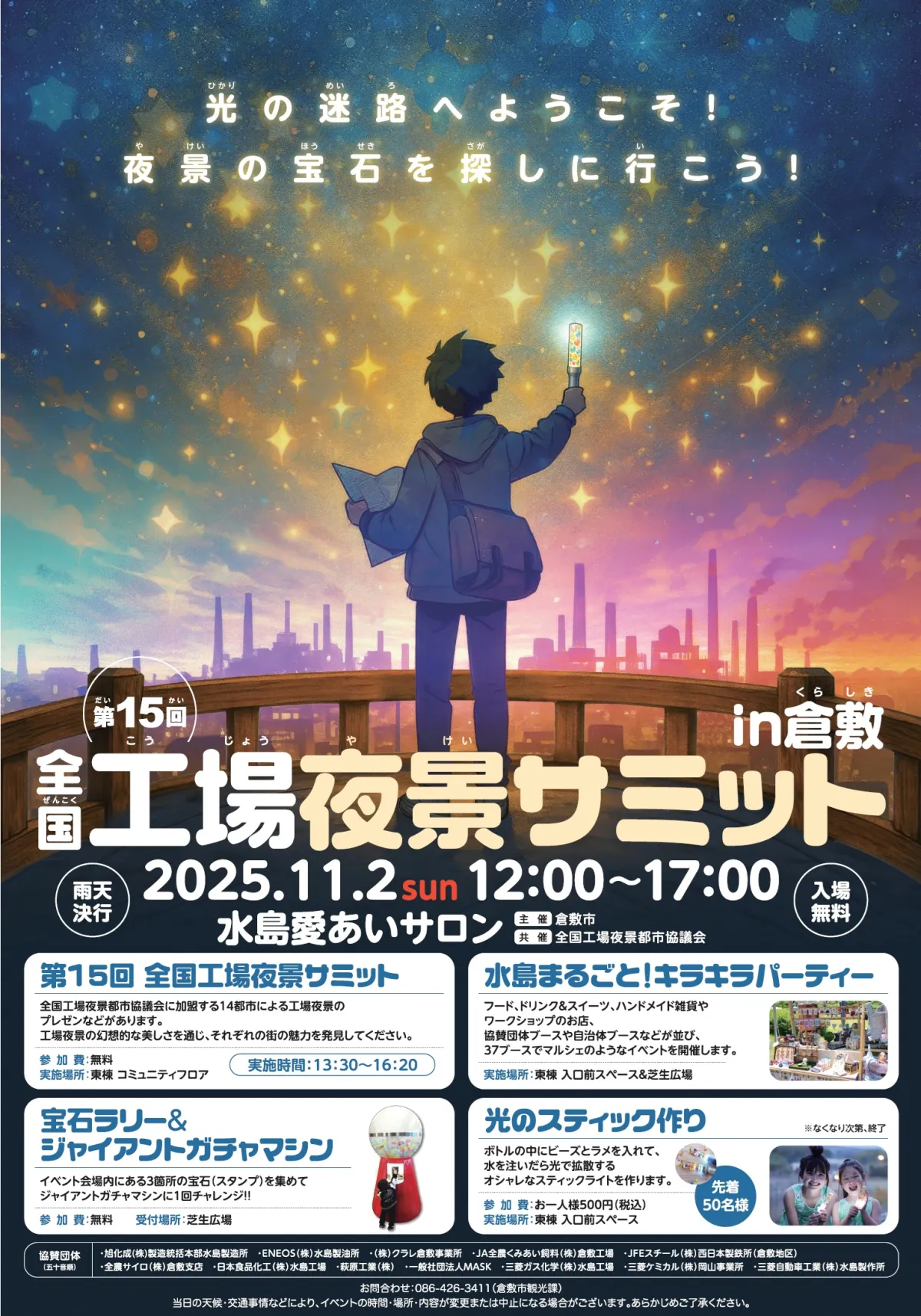 倉敷市での「全国工場夜景サミット in 倉敷」は、工場夜景を単なる観光資源としてだけではなく、地域全体の魅力を引き出すイベントへと進化しています。工場の美しさと地域の文化を同時に楽しみながら、皆で素晴らしい一日を共有することができるこの機会を、ぜひお見逃しなく!