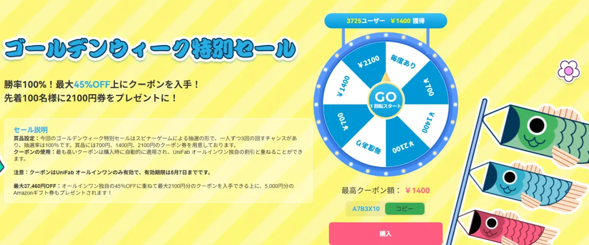 この特別セールの目玉は、「割引+福引+新味」のトリプル特典です。特に注目すべきは、スピナーゲーム形式で実施されるクーポン抽選です。参加者は700円から最大2,100円のクーポンを獲得でき、先着の100名は必ず2,100円のクーポンを手に入れることができます。このクーポンはUniFabオールインワンの購入に使用可能で、さらに独自の45%割引と組み合わせることができます。