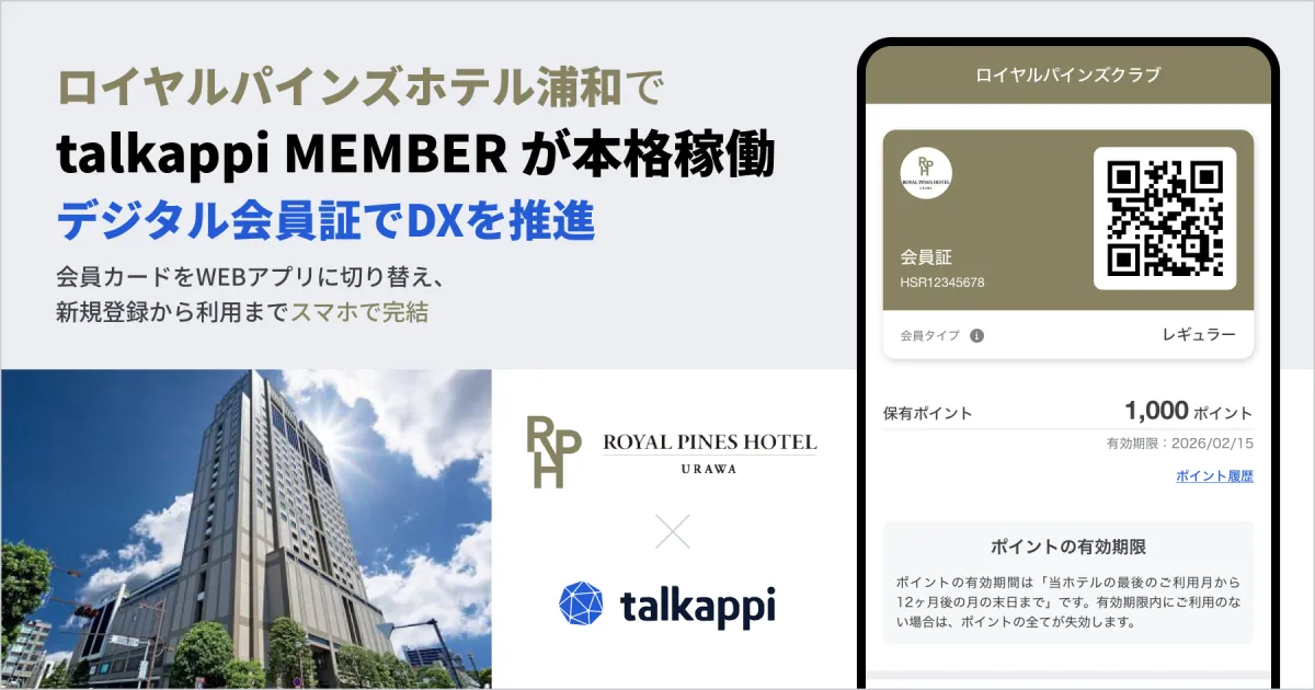 埼玉県さいたま市に位置するロイヤルパインズホテル浦和は、観光・宿泊施設向けのSaaS型会員システム「talkappi MEMBER」導入を2025年2月に開始します。この新しいサービスは、会員カードからウェブアプリへの移行を促進し、宿泊業界におけるデジタルトランスフォーメーション(DX)を加速させる狙いがあります。