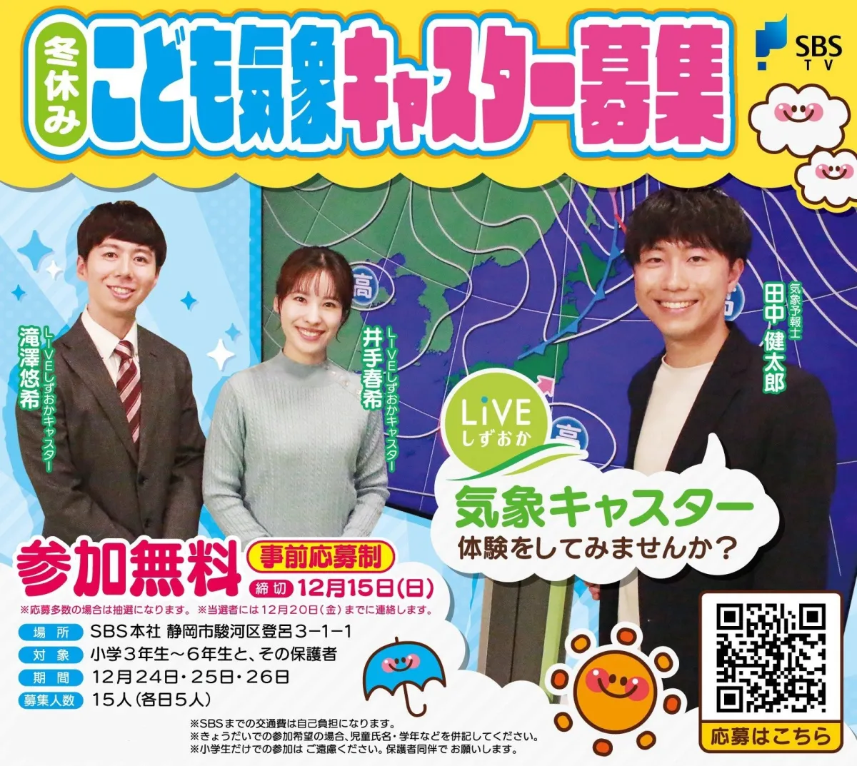 2024年度の冬休みに合わせて、SBSテレビが「こども気象キャスター」プログラムを開催します。このイベントは、子どもたちにテレビや気象に親しんでもらうことを目的としており、冬休み期間中の貴重な体験が提供されます。参加は事前応募が必要で、定員は各日5名の計15名。親子での参加が条件となっているため、保護者と一緒に体験を楽しむことができます。