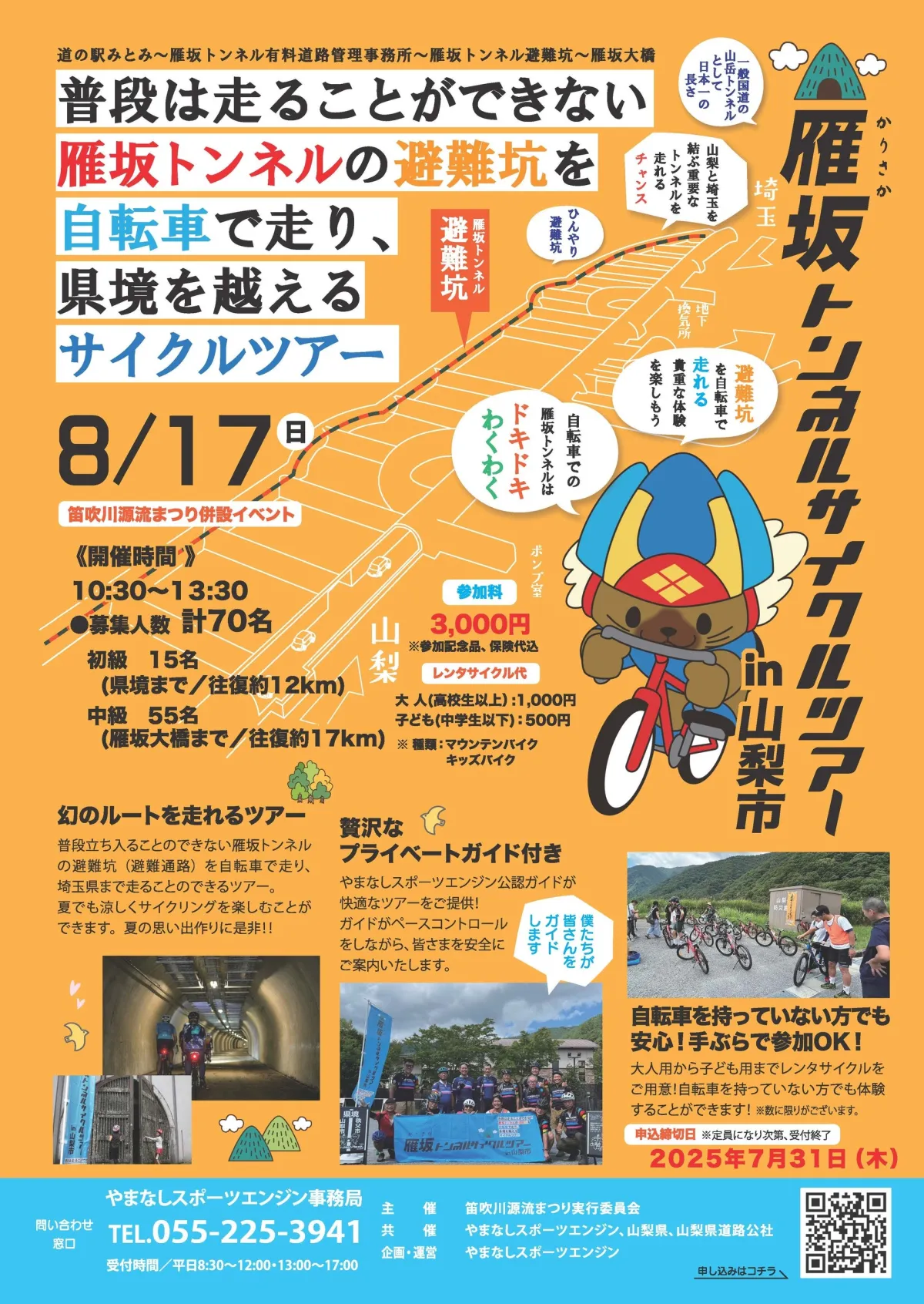この夏、山梨市で特別なサイクリング体験が待っています。「雁坂トンネルサイクルツアーin山梨市」が令和7年8月17日(日)に開催されることが決定しました。