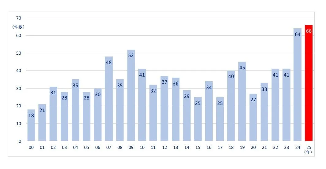 2025年の倒産件数が66件となり、この数字は2024年の64件を上回って過去最多となりました。業態別に見ても、「病院」「診療所」「歯科医院」の全てが高水準を記録しており、特に診療所が28件、歯科医院が25件の倒産を記録しています。また、負債総額は242億1900万円に上り、前年より減少したものの、依然として高額であることは認識されるべきです。