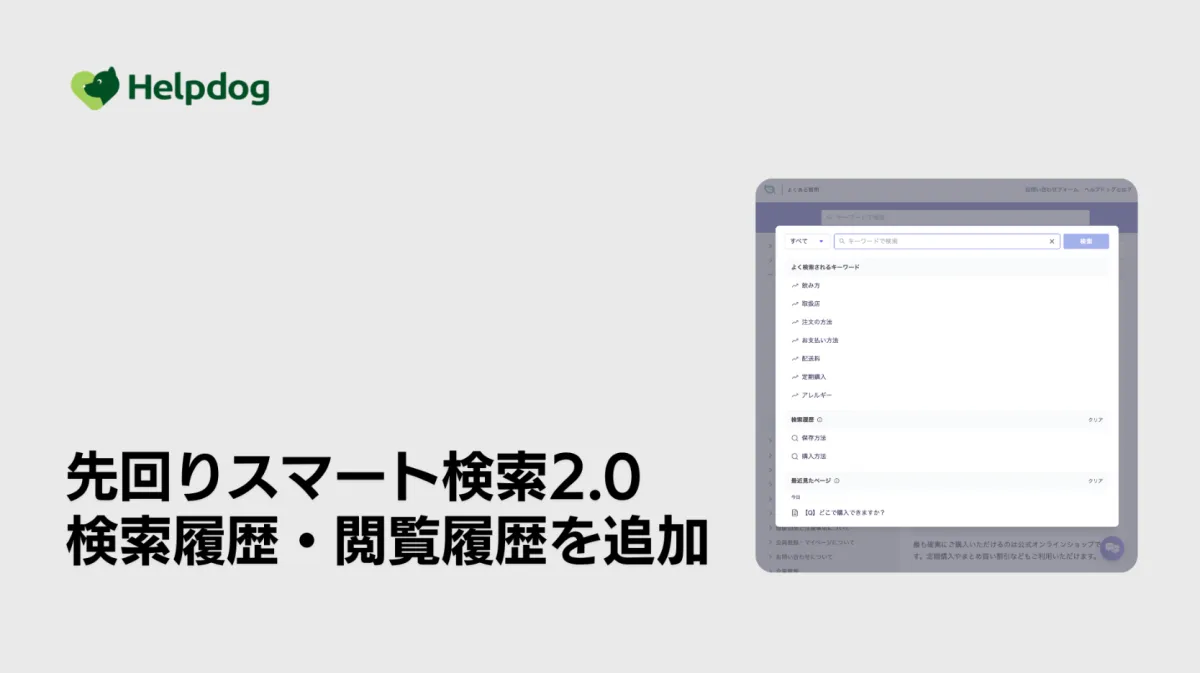 新たに登場した「先回りスマート検索2.0」は、こうした課題に立ち向かうべく設計されており、利用者が目的の記事にスムーズにアクセスできるように支援します。主な特徴として、最新のAI検索アルゴリズムを採用し、「検索履歴」と「閲覧履歴」を表示する機能を追加しました。これにより、過去に探したキーワードや、直前に参照したFAQ記事に一気に戻れるため、情報を探すストレスが大幅に軽減されます。