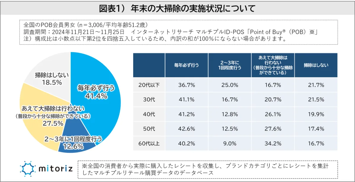 調査によれば、「毎年必ず大掃除をする」と回答した人は全体の約41.4%にとどまり、多くの人が大掃除を行うことに対してあまり強い意識を持っていないことが分かりました。逆に、27.5%の人々は「普段から十分に掃除ができているため、大掃除は行わない」と答えており、こちらの割合も無視できません。特に年代による違いが顕著で、20代以下では大掃除を行う割合が他の年代に比べてやや低く、徐々に年齢を重ねるごとにその必要性を感じる人が増えるようです。