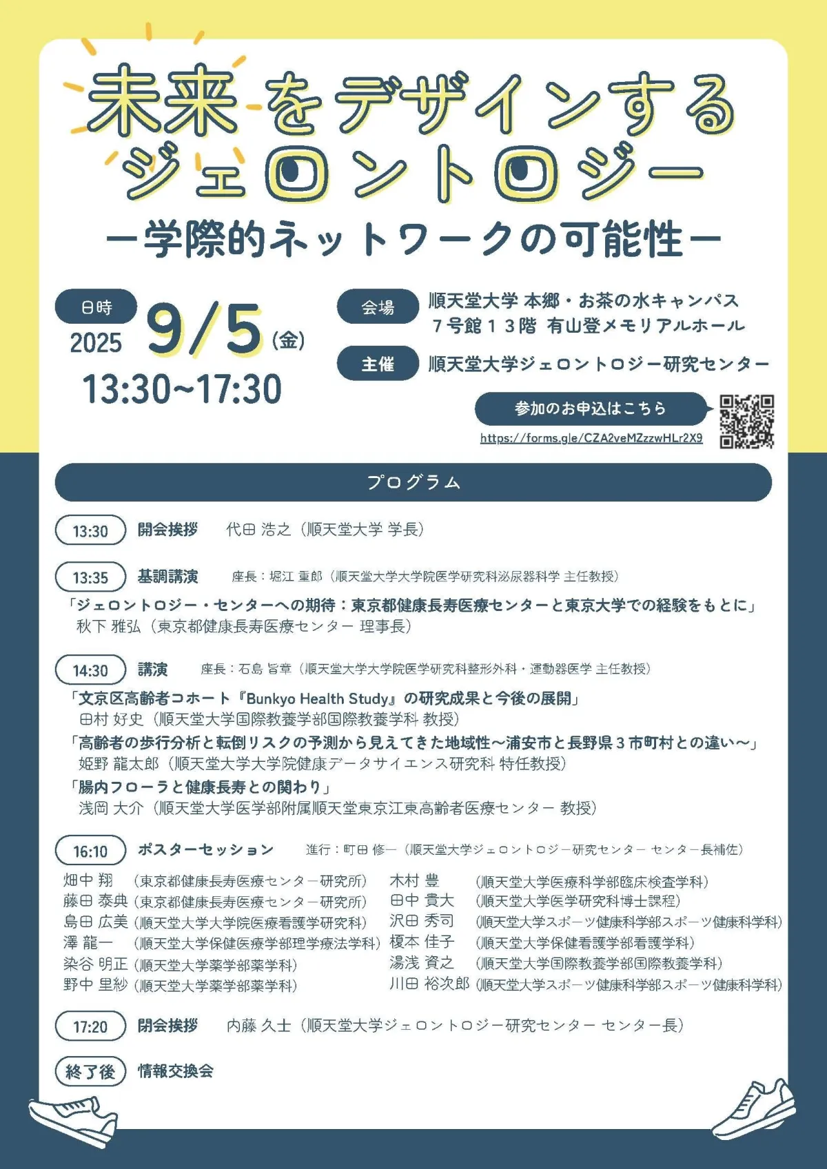 2025年9月5日(金)、順天堂大学健康総合科学先端研究機構は「未来をデザインするジェロントロジー -学際的ネットワークの可能性 -」というテーマのシンポジウムを開催します。本イベントは、超高齢社会を迎えた日本において、持続可能なウェルビーイングの実現を目指し、さまざまな分野の専門家が集い、最新の研究成果を共有する重要な機会です。