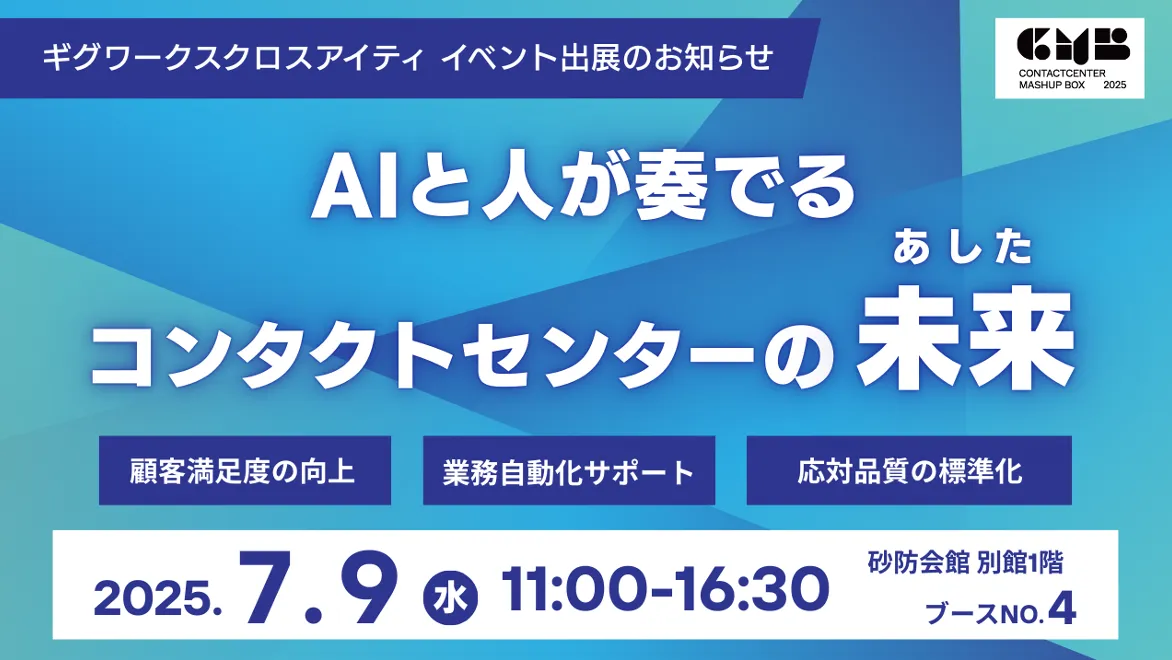 2025年7月9日(水)、株式会社コムデザインが主催する「ContactCenter MashUp BOX 2025」が開催されます。このイベントは、コンタクトセンター業界の専門家が集まり、最新のトレンドや技術を共有する貴重な機会です。ギグワークスクロスアイティ株式会社も出展し、AIと人がどのように協力してコンタクトセンターの未来を作り上げているのかを探ります。
