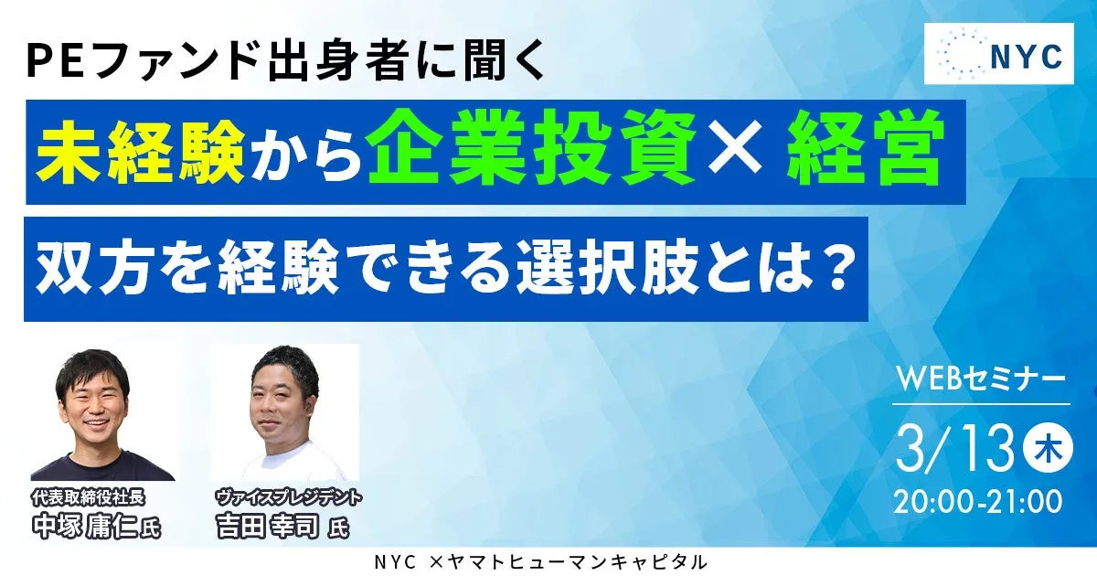 2025年3月13日、ヤマトヒューマンキャピタル株式会社が主催するオンラインセミナー『未経験から「企業投資」と「経営」双方を経験できる選択肢とは?』が開催されます。このセミナーは、PEファンド出身者であり、NYC株式会社の代表取締役社長である中塚庸仁氏とヴァイスプレジデントの吉田幸司氏をゲストに迎え、企業投資の世界を深く掘り下げることを目的としています。