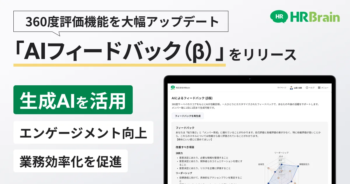 株式会社HRBrainは、従来の360度評価機能を大幅にアップデートし、OpenAI社のAPIを利用した新しい機能「AIフィードバック(β)」を発表しました。この新機能は、生成AIをベースにしたもので、評価結果の自動要約から改善点、具体的なアクション案までを提案することができます。