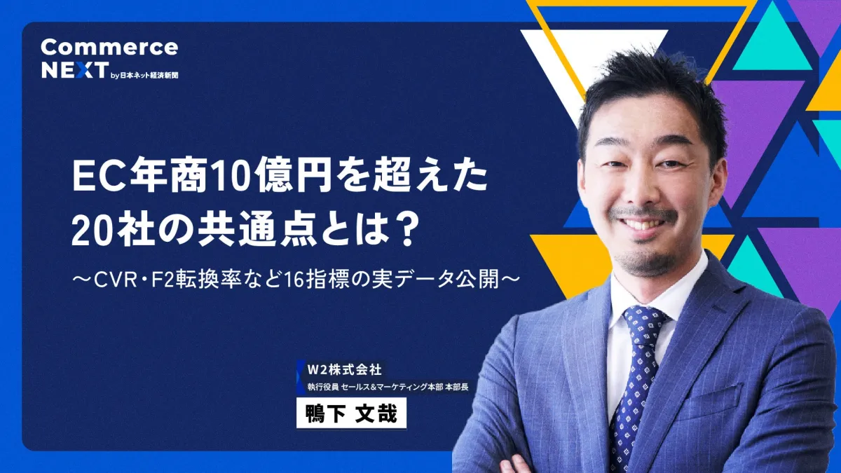 セミナー初日のスペシャリストセッションにて、W2の執行役員である鴨下文哉氏が登壇します。彼の講演題は「EC年商10億円を超えた20社の共通点とは? 〜CVR・F2転換率など16指標の実データ公開〜」。これは、EC業界における売上の成長に悩む経営者やマネージャーにとって、非常に重要な内容です。鴨下氏は、850社以上の支援先の中から年商10億円を超える20社のデータを集め、その実績に基づいて成功の秘訣を解説します。