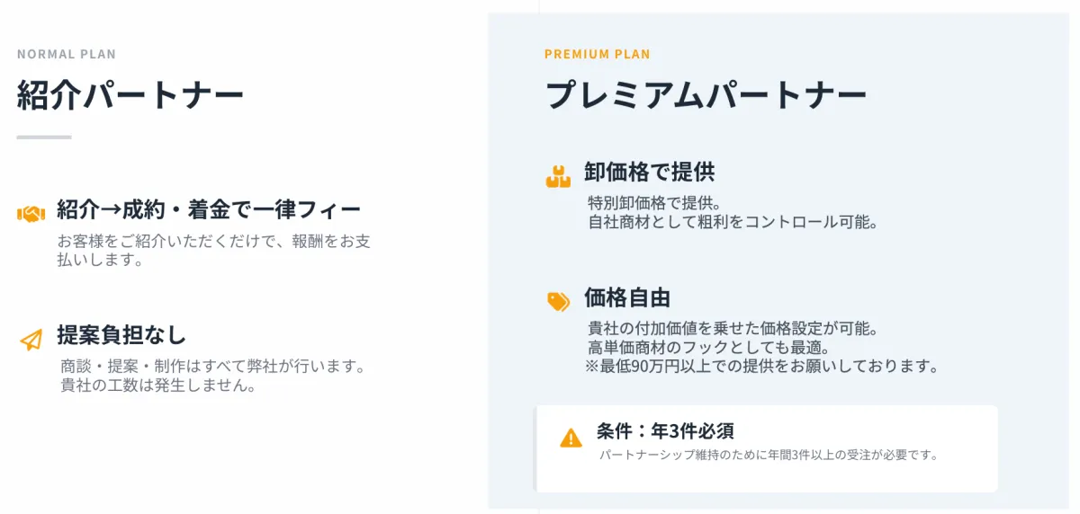 この二つのプランにより、パートナー企業の収益モデルも柔軟に構築でき、特に新規案件の紹介や自社商材としての展開が行いやすくなります。