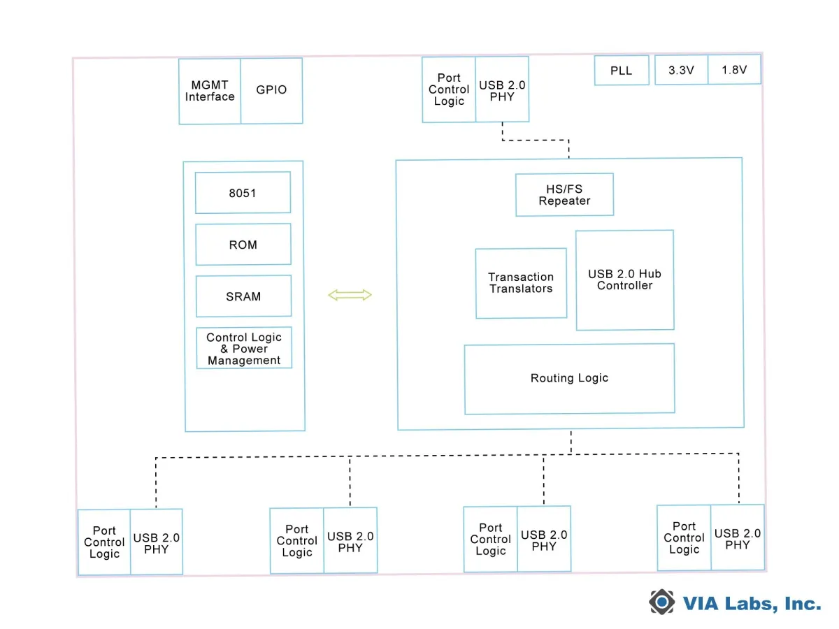 VL123は、複数のUSBフルスピードデバイスが同時に動作する際のスループットを向上させるMTTアーキテクチャを搭載したUSB2.0ハブコントローラです。VL122とピン互換性があり、柔軟な設定管理をサポートしています。