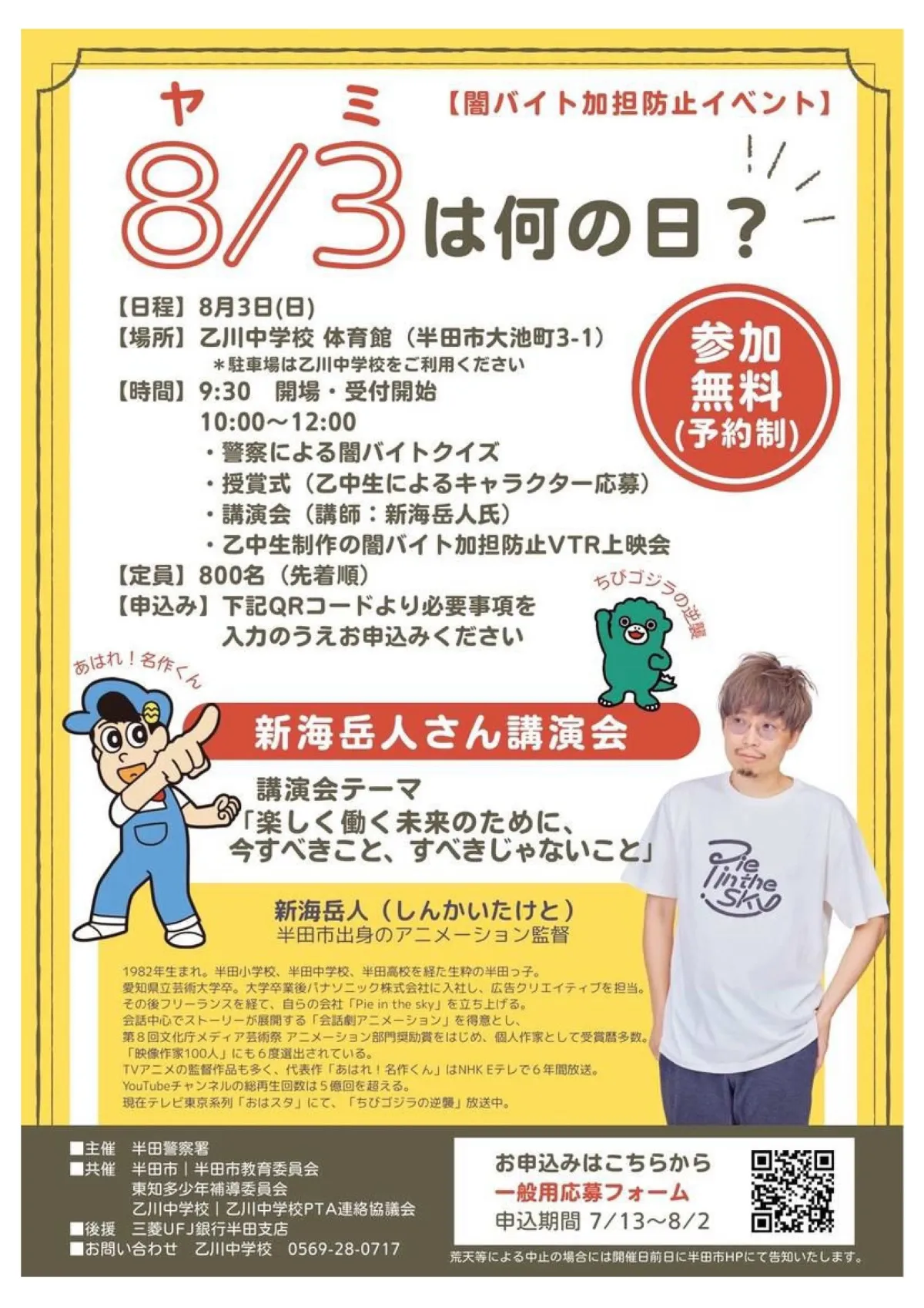 新海岳人氏は、8月3日(日)のイベントにおいて「楽しく働く未来のために、今すべきこと、すべきじゃないこと」と題した講演を行います。アニメーションの創造者としての経験を通じて、若者たちが知識を得られる貴重な機会です。講演時間は午前11時から約45分間の予定です。