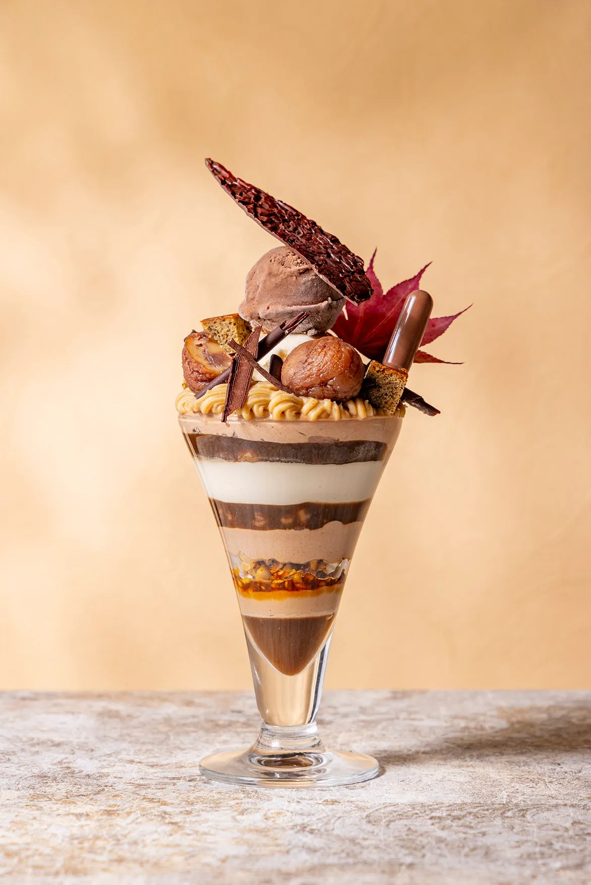 「艶」は、濃厚なマロンと贅沢なチョコレート、香ばしいコーヒーの香りが織りなす秋の贅沢な味わいです。チョコレートチップやココアバターで作られたマロンアイス、バニラキャラメルナッツアイスが重なり合い、まろやかな甘さと深いコクを生み出します。特に、ビターなチョコレートソースが甘さを引き締め、秋の風味を際立たせます。この一品は、大人のための上品なパフェです。