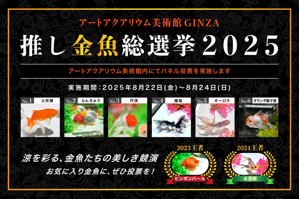 2025年8月、銀座のアートアクアリウム美術館では「推し金魚総選挙2025」が開催されます。このイベントは毎年、金魚界の人気No.1を選ぶ競争で、楽しみながら金魚の魅力を再発見できます。今回も多様な金魚たちが登場し、来場者による投票で人気の金魚が決まります。