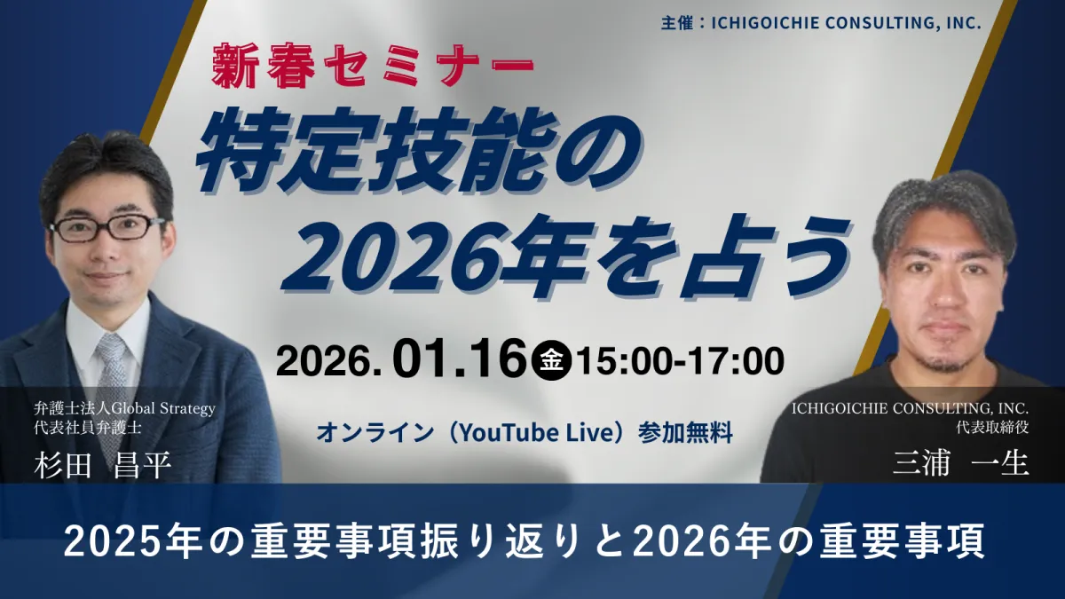 2026年1月16日(金)、ICHIGOICHIE CONSULTING, INC.が主催する新春セミナー「特定技能の2026年を占う」が開催されます。このセミナーでは、特定技能制度の重要なポイントや、2025年度の動向について詳しく解説されます。参加は無料で、オンラインでの実施となるため、どこからでも参加可能です。