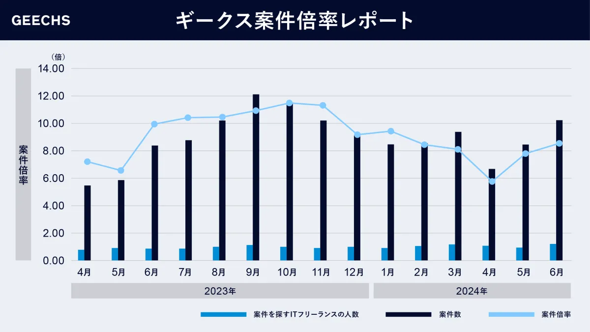 2024年の春、つまり4月から6月の期間において、ITフリーランス市場は大きな活況を見せています。この時期に発表された「ギークス案件倍率レポート」は、前年度との比較で明確な成長を示しています。案件数が前年同月比で増加し、特にフリーランスの供給側にも明るい兆しが見えてきました。