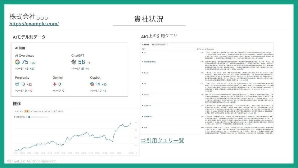 このレポートでは、ChatGPTやPerplexityなどのAIにおけるブランドの認知状況を調査します。具体的には、特定のキーワードで検索された際の「ブランド言及率」や「引用数」、さらには「インプレッション数」に関する詳細なデータを収集・分析します。