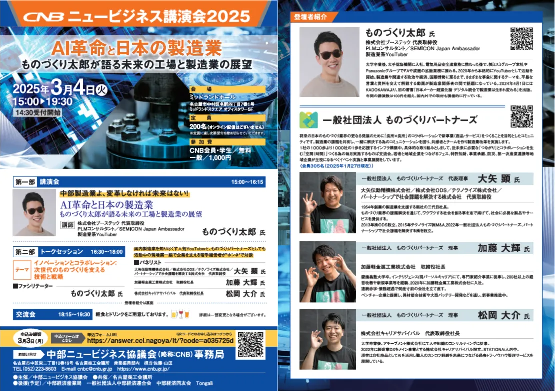 2025年3月4日に愛知県名古屋市のミッドランドスクエアで開催される「CNBニュービジネス講演会2025」において、製造業系YouTuberのものづくり太郎氏との対談が実現します。この講演会は中部地域の製造業に焦点を当て、AIの活用やスタートアップとの連携を通じて今後の製造業を考える貴重な機会です。