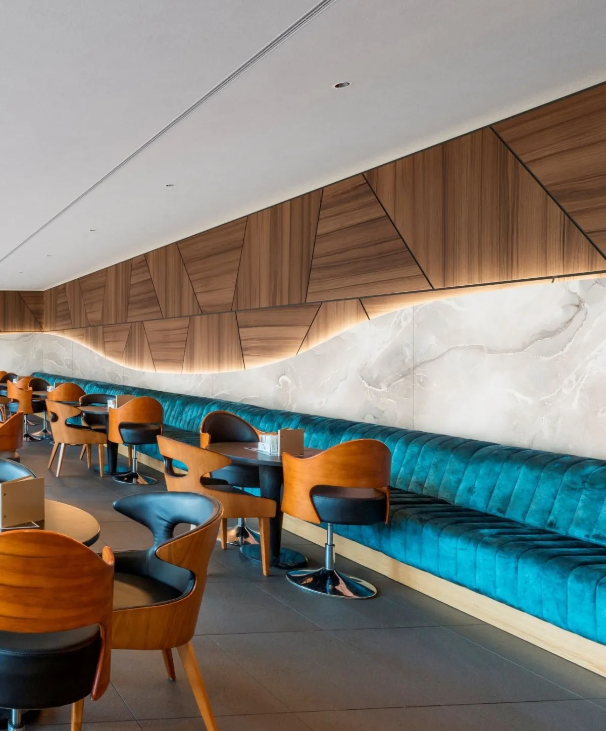 これまでのエマウォールでは複数のパネルを連結する場合、見切り材が必要でした。しかし、「レーザーカットパネルW」と「レーザーカットパネルS」では、最先端のレーザービーム技術によってパネルをカットするため、見切り材なしでシャープなラインを保つことができます。特に、突き合わせて施工する「突き付け貼り」では、シームレスかつダイナミックな壁面表現が可能となるのです。