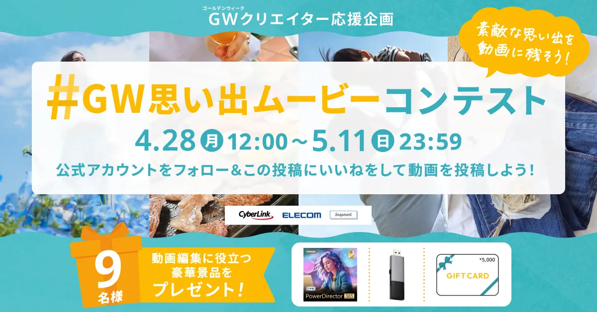 サイバーリンク株式会社は、2025年4月28日から5月11日までの期間中、動画クリエイターを応援する企画「#GW思い出ムービーコンテスト」を開催します。この取り組みは、ゴールデンウィークの思い出を映像として残し、その楽しさを広げるためのものです。サイバーリンクは、株式会社CREAVEやエレコム株式会社と協力し、コンテストを実現させました。