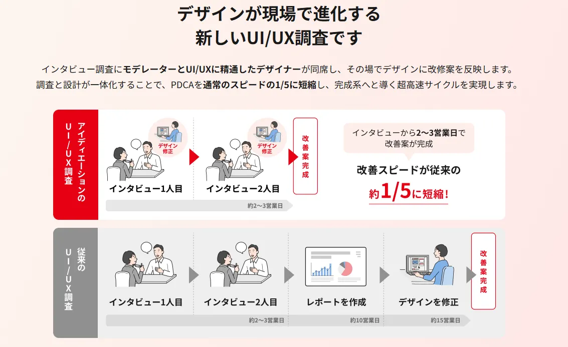 この迅速な改善が可能になる理由として、デザイナーがインタビューに同席し、リアルタイムでインサイトを吸い上げることがあります。従来の「一括調査→一括改善」というプロセスではなく、「1インタビュー=1改善」という新しいサイクルを確立しています。これにより、意思決定に必要なデータが即座に揃うため、社内の合意形成もスムーズに進みます。