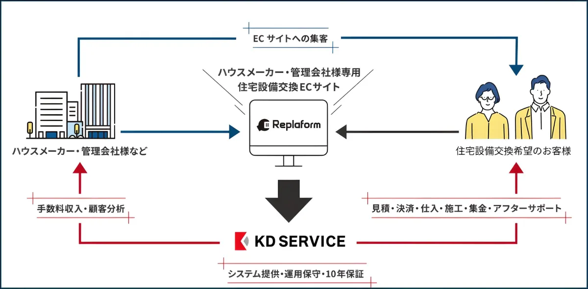 最近、住宅新築着工の減少や人口減少が進んでいることを受け、リフォーム事業の拡大が求められています。このような背景から、リフォーム関連の業界企業は新たに住宅設備の交換・リフォームEC事業を立ち上げる必要が生じています。「Replaform」は、こうしたニーズに応えるために開発されました。特に、OEM提供を希望する企業が多数ある中、当社が提供する「交換できるくん」の仕組みを実現することで市場に応えようとしています。