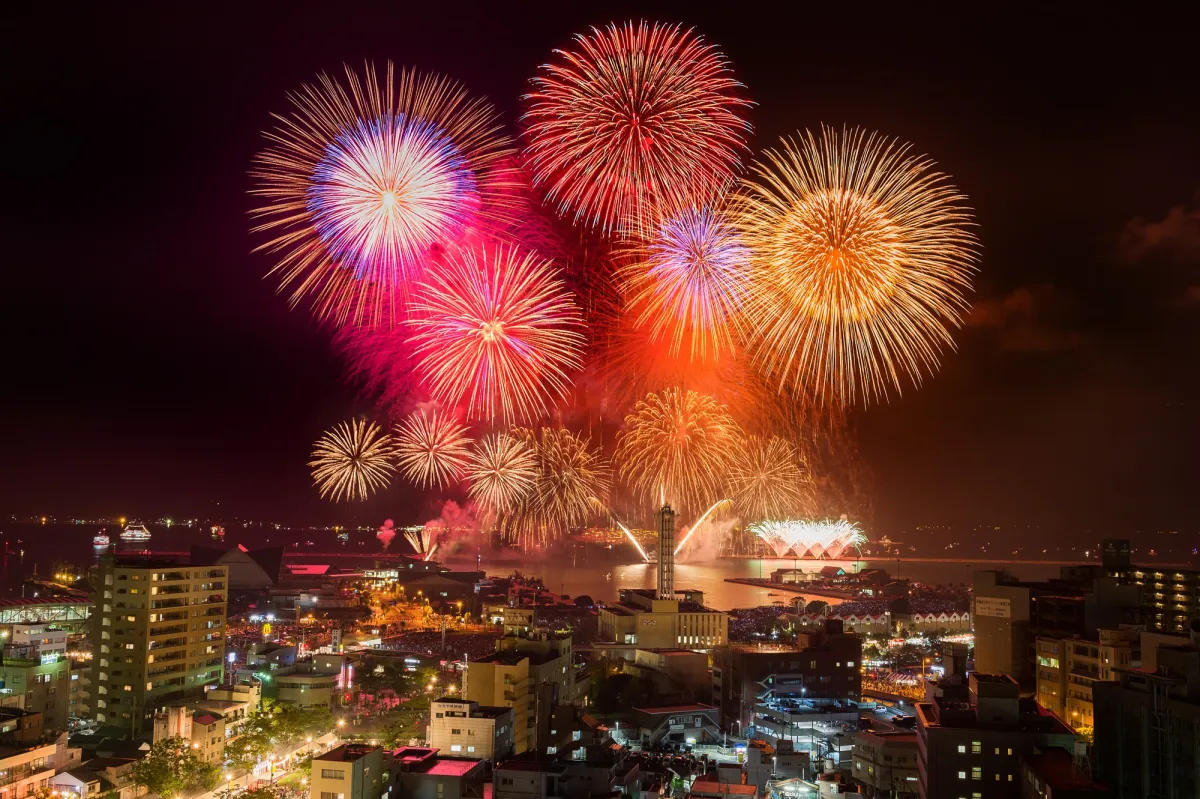 「かごしま錦江湾サマーナイト大花火大会」は、桜島を背景に約15,000発もの花火が打ち上がる九州最大の花火大会です。開催されるのは、毎年8月下旬の土曜日で、2025年は8月23日に設定されています。夕暮れが迫る頃、空が次第に暗くなる中、広がる夜空に華やかな花火が次々と打ち上げられるその光景は、観る者を魅了します。毎年15万人もの来場者が集まるこのイベントは、鹿児島の夏を象徴する風物詩として、多世代にわたって親しまれています。