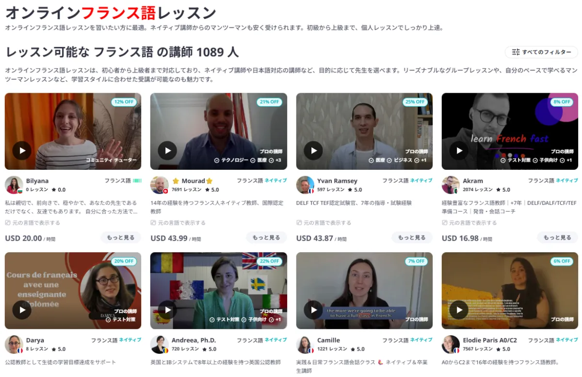 日本では英会話の需要が高まり続けていますが、フランス語の市場はまだまだ発展途上です。英語に比べると講師が少なく、レッスンの価格が高くなりがちなフランス語ですが、italkiでは世界中のネイティブ講師から、リーズナブルな価格でマンツーマンのレッスンを受けることが可能です。フランス語講師が1,000人以上いるitalkiでは、学習者にとって非常に魅力的な選択肢を提供しています。