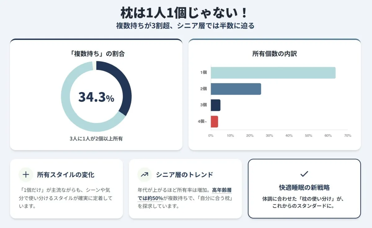 近年、睡眠に関するライフスタイルが大きく変化しています。まくら株式会社が実施した最新の調査によると、枕を複数持つ人が全体の34.3%を占めることが分かりました。この数字は、もはや「枕は1人1個」という古い常識を覆しています。特に60代以上では、なんと半数以上が2個以上の枕を所有しているという結果が見られました。このような現象は「枕の多様化」と呼ばれ、体調や気分に応じて選べる冷暖房効果のあるものや、肩こり対策用の枕など、さまざまな機能が求められています。
