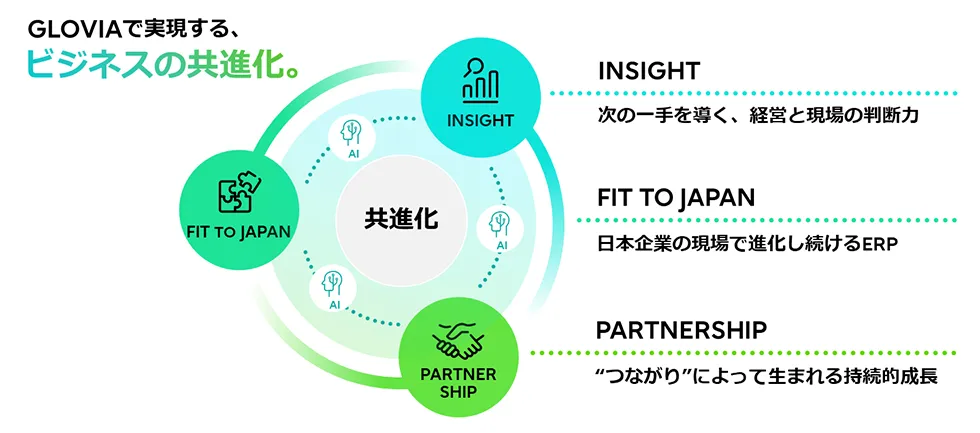 「GLOVIA One」におけるFIT TO JAPANのアプローチは、日本の企業が抱える特有の業務ニーズに適合させるという特徴があります。単なる業務の標準化ではなく、Japanの現場での独自の知見や改善活動と共存し、業務に適した機能を提供します。これにより、企業は業務の変更を強いられることなく、必要な機能だけを選ぶことができます。