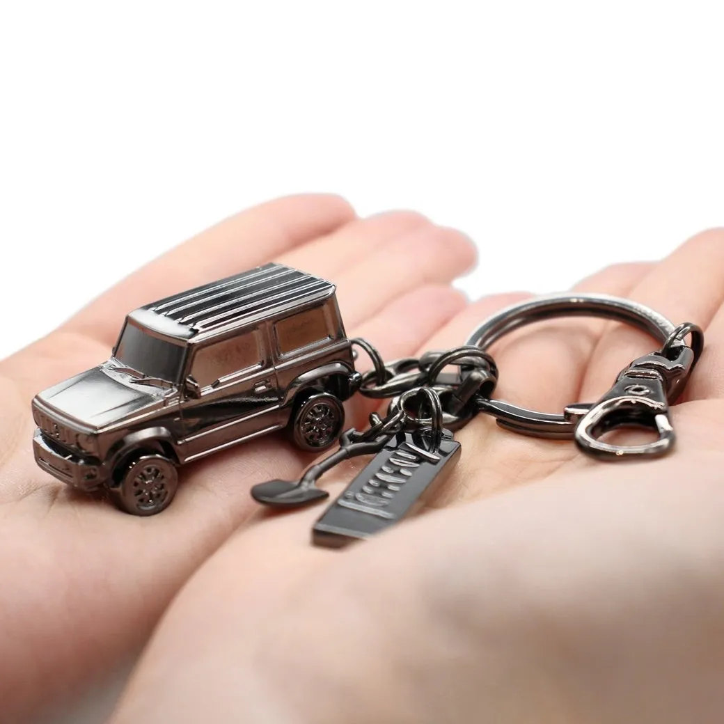 キーチェーンには小さなシャベル型のチャームが添えられ、JIMNYの刻印が入ったロゴプレートも付属しています。このデザインには遊び心がたっぷり詰まっており、ジムニー愛を感じさせるような仕上がりになっています。