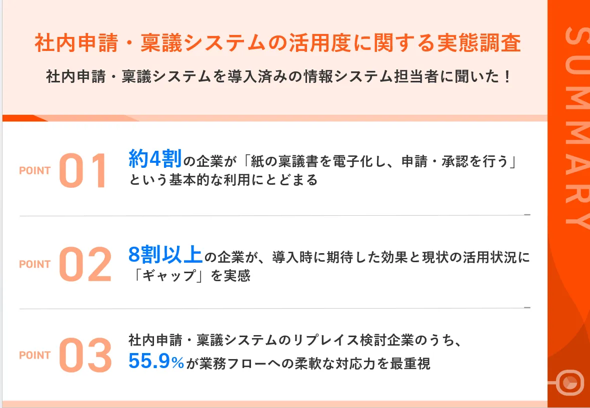 - - 社内申請・稟議システムの活用状況: 約39.3%の企業が、申請・承認を行うために紙の稟議書を電子化していると回答。