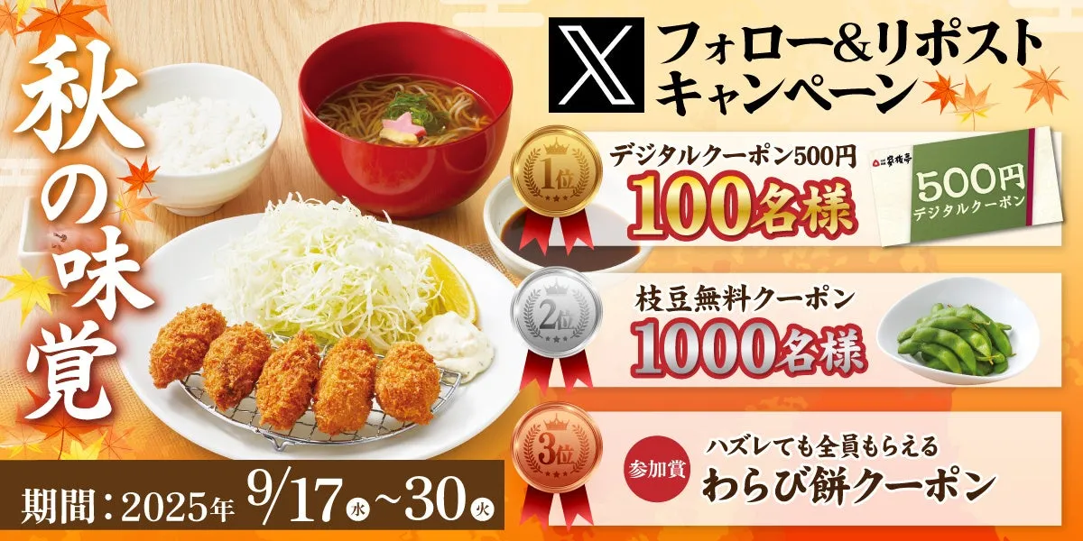 2025年9月17日(水)午後8時から9月30日(火)まで、家族亭の公式Xアカウント(@kazokutei_oic)をフォローし、キャンペーン投稿をリポストすることで、抽選に参加できます。参加者の中から、以下の賞品が提供されます。