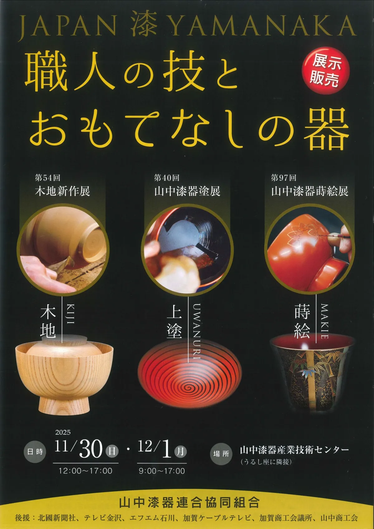 加賀温泉郷の一員として有名な山中漆器は、優れた木地挽物漆器の産地としてその名を轟かせています。このたび、山中漆器の職人たちが集結し、その技術と感性を結集した合同展示会「職人の技とおもてなしの器」を開催します。