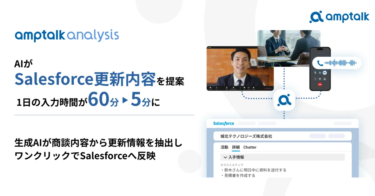 営業活動において重要なことは、正確かつ迅速なデータ入力です。amptalk株式会社が提供する「amptalk analysis」は、AIを駆使して商談内容の文字起こしからSalesforceの更新項目を自動で提案する新機能「タスクリスト」を発表しました。これは、従来の営業担当者が1日あたり約60分を費やしていたデータ入力作業を、わずか5分に短縮することを目的としています。
