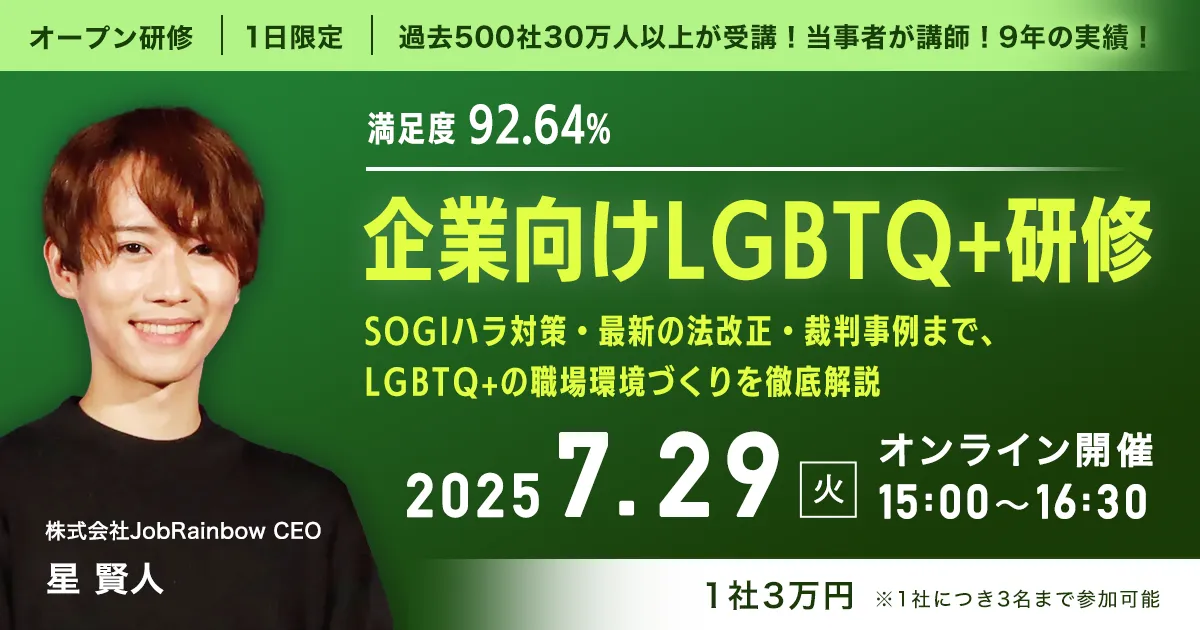 2023年に施行されたLGBT理解増進法は、LGBTQ+領域に新たな潮流をもたらしました。この背景には、社会全体の多様性を重視する動きが増していることが挙げられます。特に、SOGI(Sexual Orientation and Gender Identity)に関連する法改正や判例も次々と発表され、企業におけるLGBTQ+への理解と対応が求められています。これに対抗するため、株式会社JobRainbowは、2025年7月29日(火)にオンラインで企業向けのオープン研修を開催します。