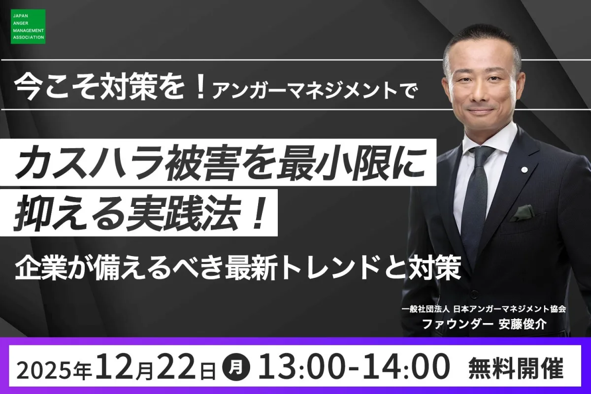2025年締めくくりとして、一般社団法人日本アンガーマネジメント協会が、オンラインセミナー「今こそ対策を!アンガーマネジメントでカスハラ被害を最小限に抑える実践法」を2025年12月22日(月)に開催します。このセミナーでは、カスタマーハラスメント(カスハラ)をテーマに、従業員が安全に対処する方法を学ぶことができます。