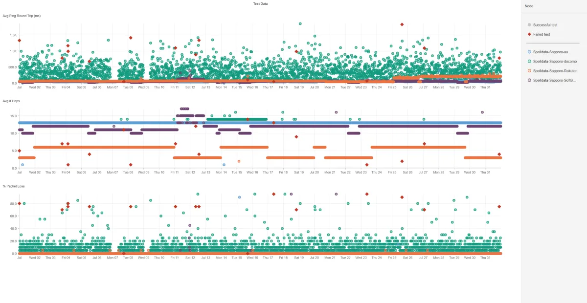 本調査は、2025年7月1日から31日までの期間中に、全国6か所の計測センターで行われました。Synthetic Monitoring技術を利用し、15分ごとにランダムなタイミングで回線の応答速度(Ping)、ホップ数、パケットロス率など様々な指標を測定しました。この手法により、普段のユーザー体験に密接に関連したデータを取得し、より精度の高い通信品質評価が実現しました。