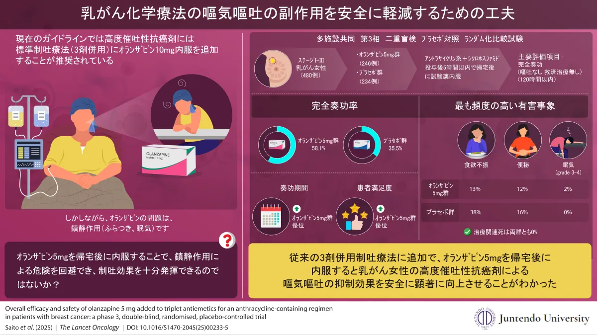また、少量で効果が得られるということは、患者さんの経済的な負担を軽減する要素ともなります。経済毒性が問題視される中、オランザピンの使用は費用対効果の観点からも重要な意義を持つとのことです。治療の安全性を担保しつつ、過剰な経済的負担を回避できる可能性が示されたことは、今後の治療法の選択にも影響を与えることでしょう。
