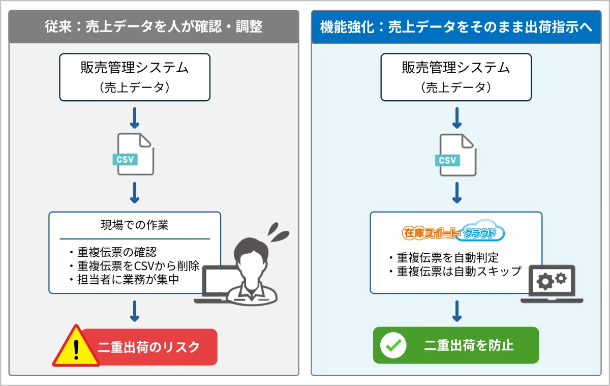 多くの企業では、販売管理システムが請求や売上管理を中心に設計されており、倉庫への出荷指示を考慮したデータ構造には設計されていないため、運用上の課題が多発しています。具体的には、販売管理システムから出力された売上伝票データを倉庫側で出荷指示データとして利用する際には、重複チェックや手動でのデータ加工が必須でした。