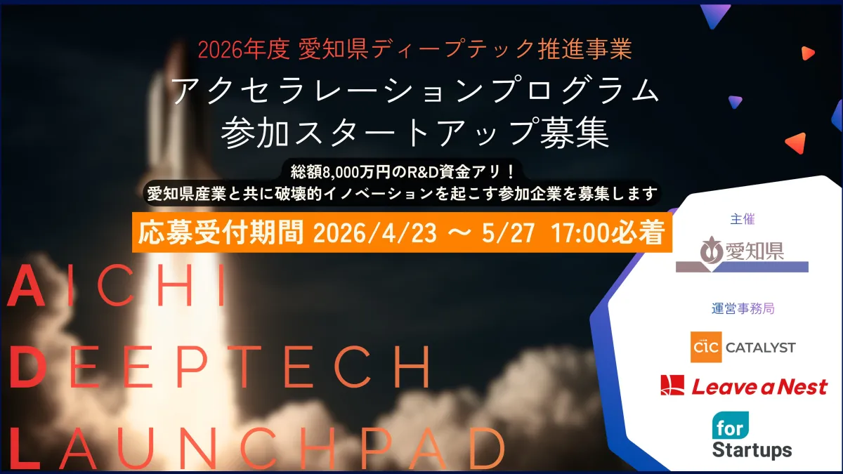 愛知県が展開するディープテック支援プログラム「Aichi Deeptech Launchpad」の2026年度の参加企業募集が始まりました。このプログラムは、プレシード及びシード期にあるディープテック系スタートアップを対象にした、革新的な成長支援のプラットフォームです。