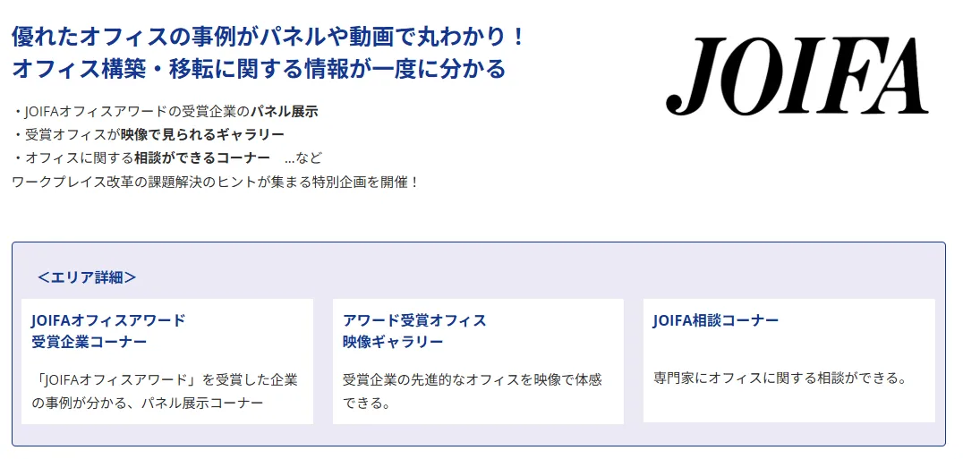 ワークプレイス改革EXPOでは、オフィスデザインからリモートオフィス、働き方コンサルティングに至るまで、様々な製品やサービスが出展されます。また、特設エリアとして「JOIFAオフィスアワード」を設け、継続的なオフィス改善に取り組む企業を表彰します。このエリアでは、受賞した企業の優れた事例を実際に見ることができ、具体的なアイデアを得る機会も提供されます。